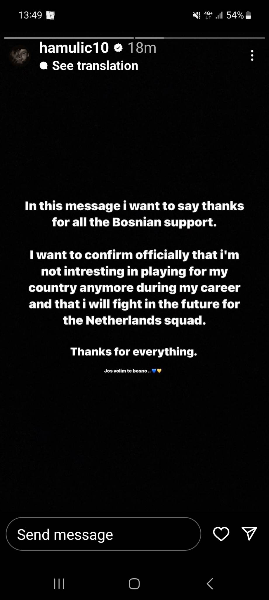“Želim službeno potvrditi kako ne želim više igrati za svoju zemlju tokom svoje karijere. Borit ću se da igram za Nizozemsku”, napisao je Hamulić, uz poruku “da voli Bosnu”.
