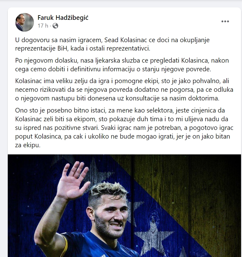 Ono što je posebno bitno istaći, za mene kao selektora, jeste činjenica da Kolašinac želi biti sa ekipom, što pokazuje duh tima i to mi ulijeva nadu da su ispred nas pozitivne stvari. Svaki igrač nam je potreban, a pogotovo igrač poput Kolašinca, pa čak i ukoliko ne bude mogao igrati, jer je on jako bitan za ekipu”, napisao je Hadžibegić.