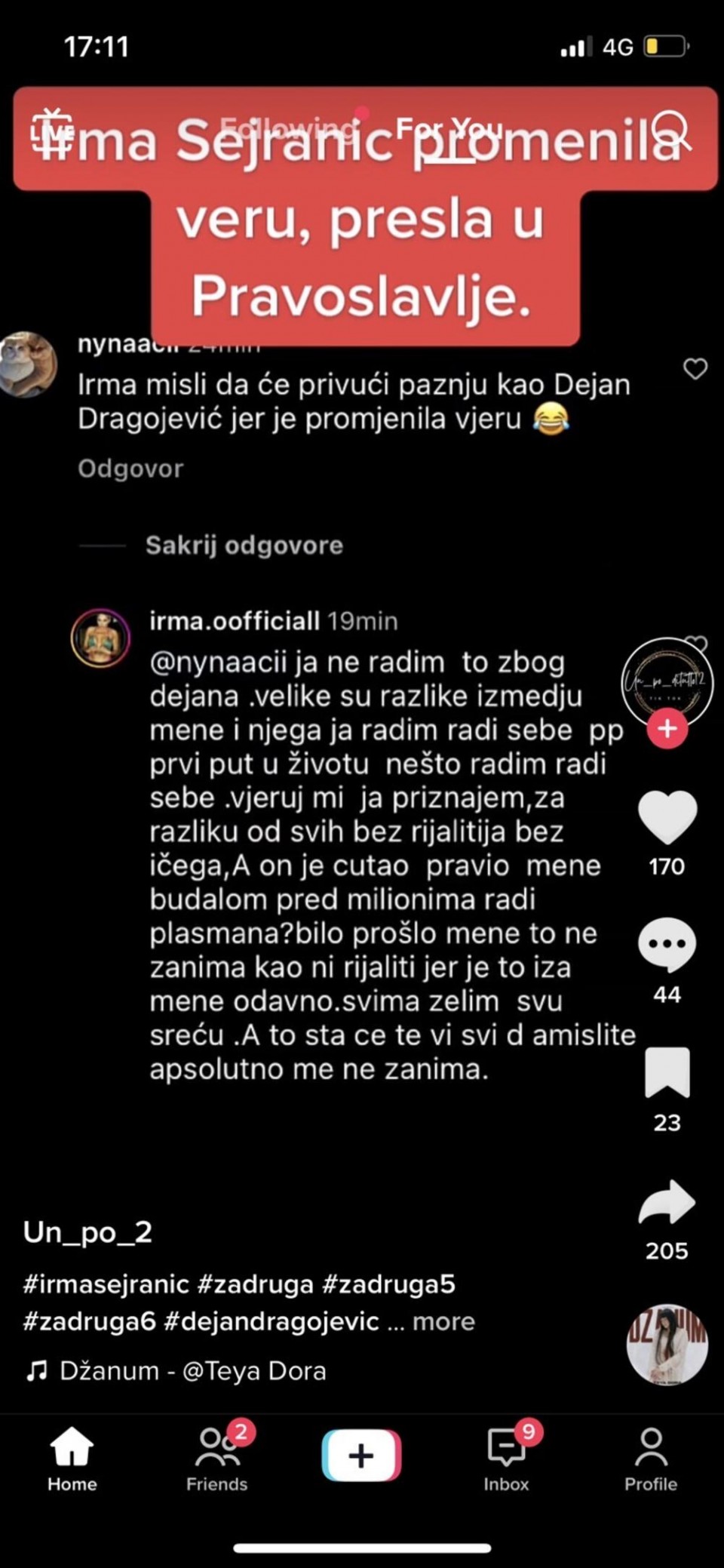 Irma je očito slijedila svog kolegu iz Zadruge, Dejanu Dragojeviću, te promijenila vjeru, ali u ovom slučaju, ona je iz islama prešla u pravoslavlje.