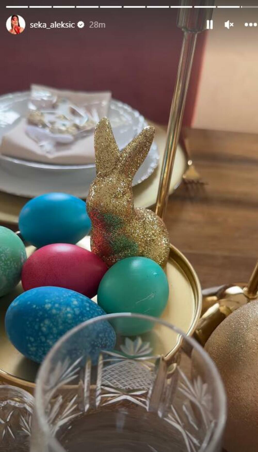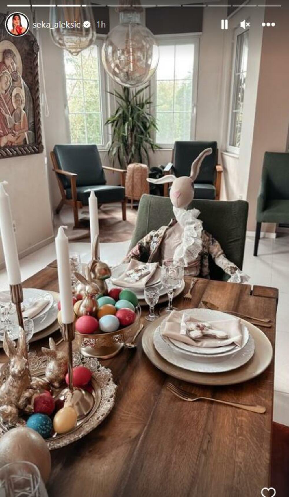 Seka je pokazala svojim pratiocima na Instagramu njenu Uskršnju trpezu, a ono što je privuklo takođe pažnju jeste dekoracija koja se našla na njenom stolu. Aleksićeva je snimila sto na kojem su svećnjaci, medenjaci u obliku krsta, šarena jaja, kao i zeke, a uz sve to i prelepo cveće.