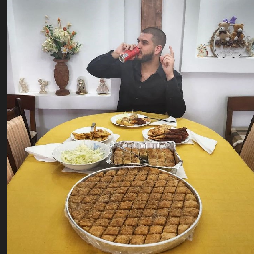 – Bajram je stigao. Ramazan je savršen. Bajramski ručak je tu. Sad trenutno ručam sam, ali baba će doći da ruča sa mnom, jer je jedina kući. Zvaću i kevu isto. Baklava od Šeika mog brata, Alah da ga nagradi. Ćevapi, mantije, rekao sam da ću kući da pravim Bajram, pa su me braća pogurala. Zvaću kevu da proba baklavu – počeo je on.