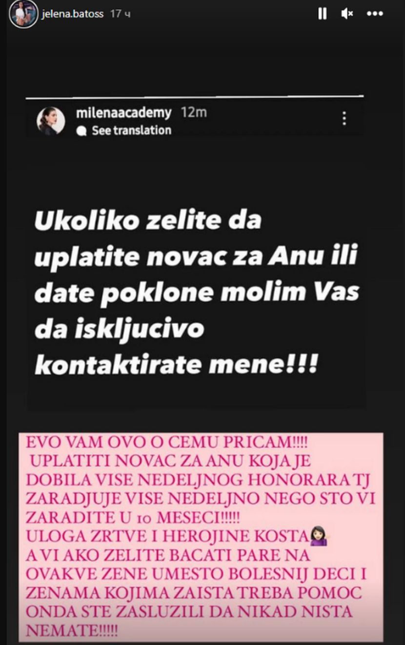 – Ukoliko želite da uplatite novac za Anu ili date poklone, molim Vas da isključivo kontaktirate mene – napisala je Milena, a tim povodom se odmah oglasila bivša rijaliti učesnica Jelena Batos.