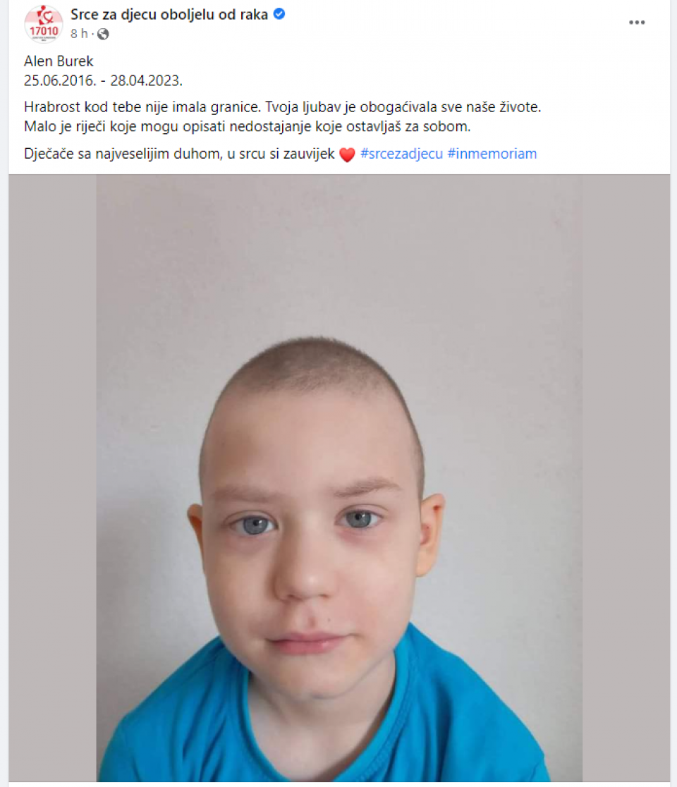 – Hrabrost kod tebe nije imala granice. Tvoja ljubav je obogaćivala sve naše živote. Dječače sa najveselijim duhom, u srcu si zauvijek – napisali su iz “Udruženja Srce za djecu oboljelu od raka”.