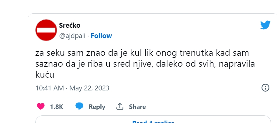 „Za Seku sam znao da je kul lik onog trenutka kada sam saznao da je riba, usred njive, daleko od svih, napravila kuću“, napisao je korisnik Tvitera.