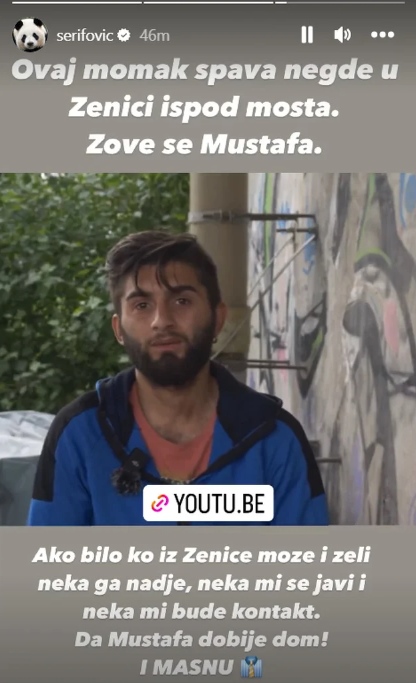 Ovaj momak spava negdje u Zenici ispod mosta. Ako bilo ko iz Zenice može i želi neka ga nađe, neka mi se javi i neka mi bude kontakt. Da Mustafa dobije dom. I MAŠNU”, napisala je Marija na svom Instagram storyju.