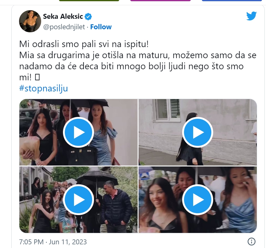 Podsetimo, nakon što se u javnosti pojavila informacija da je devojčica iz Vrbasa trpela vršnjačko nasilje i da je ostala bez pratnje za matursko veče, pevačica Seka Aleksić se oglasila na Tviteru i stupila u kontakt sa porodicom devojčice, pa je obećala da će biti njena pratnja za matursko veče, što je i ispunila.