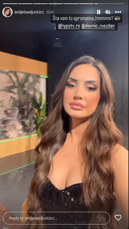 Zvezdan i ja smo na večeri. Poslije cijelog dana snimanja, stvarno smo umorni. Moram da vam otkrijem da je snimanje prošlo fantastično i oduševićete se kada vidite ko je naš prvi gost – rekla je Anđela u snimku koji je okačila na svom Instagram profilu.