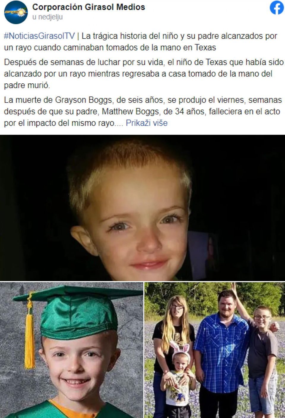 Smrt Grejsona Bogsa bila je peta žrtva od munje u ovoj godini u SAD i druga u Teksasu. Metju Bogs (34), otac šestogodišnjaka, bio je prvi u državi ove godine. To se dogodilo nešto poslije 17 sati 15. maja u malom gradu u centralnom Teksasu kada je stigao autobus da odveze Grejsona iz vrtića i njegovog 11-godišnjeg brata Elijaha.