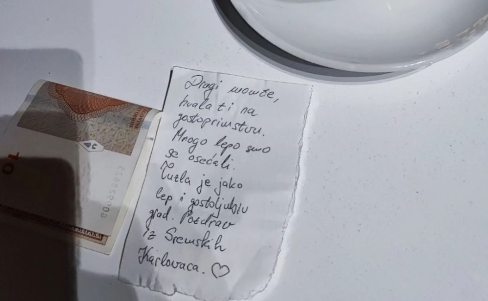 “Radim kao konobar u jednom kafiću u Tuzli. Skoro su mi bili gosti iz Srbije, tačnije bračni par srednjih godina, a kasnije sam saznao da su konkretno iz Sremskih Karlovaca. Naručili su dvije kafe, uredno i ljubazno sam ih uslužio i tako smo, dok su uživali u svojim kaficama, malo po malo došli u razgovor. Rekli su da im je ovo prvi put da su došli u naš grad te da im se jako svidio. Pitao sam ih šta su obišli i nakon njihovog odgovora sam im preporučio još neke destinacije. Primijetio sam da su porodični ljudi i prosto im neka dobrota izbija iz njihovih ozarenih lica,” navodi konobar, te dodaje: