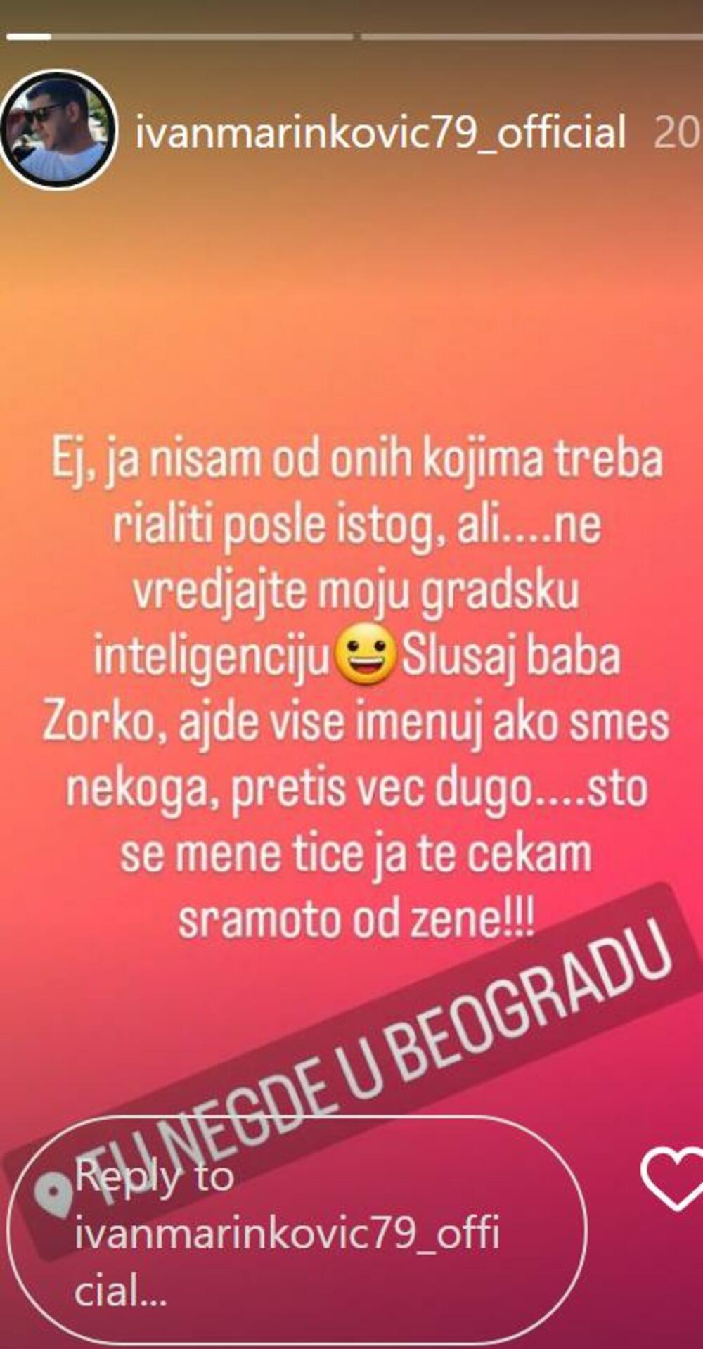 – Ej, ja nisam od onih kojima treba rijaliti posle istog, ali ne vređajte moju gradsku inteligenciju. Slušaj baba Zorko, ajde više imenuj ako smeš nekoga, pretiš već dugo… Što se mene tiče, ja te čekam sramoto od žene – napisao je Marinković, uz lokaciju “Tu negde u Beogradu”.