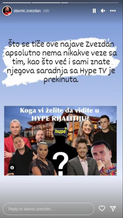 – Što se tiče ove najave Zvezdan apsolutno nema nikakve veze sa tim, kao što već i sami znate njegova saradnja sa Hype Tv je prekinuta – napisano je na storiju.
