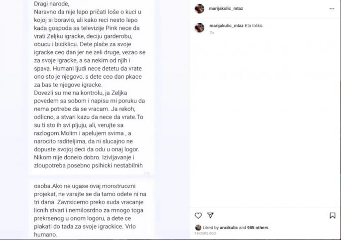 – Dragi narode, naravno da nije lepo pričati loše o kući u kojoj si boravio, ali kako reći nešto lepo kada gospoda sa televizije Pink neće da vrate Željku igračke, dečiju garderobu, obuću i bicikl. Dete plače zbog svojih igračaka, a sa nekima od njih i spava. Humani ljudi neće da vrate detetu ono što je njegovo, a dete ceo dan plače zbog baš tih njegovih igračaka. Dovezli su me na kontrolu, ja Željka povedem sa sobom i napišu mi poruku da nema potrebe da se vraćam. Ja rekoh odlično, a stvari kažu da neće da vrate. To su ti što ih svi pljuju, ali verujte s razlogom. Molim i apelujem na sve, a naročito na roditelje, da ni slučajno ne dopuste svojoj deci da odu u onaj logor. Nikom nije donelo dobro. Iživljavanje i zloupotreba posebno psihički nestabilnih osoba. Ako ne ugase ovaj monstruozni projekat, ne varajte se da tamo odete ni na tri dana. Završićemo preko suda vraćanje ličnih stvari i nemilosrdno za mnogo toga prekršenog u onom logoru, a dete će plakati do tada zbog svojih igračkica. Vrlo humano – napisala je tada Marija Kulić.