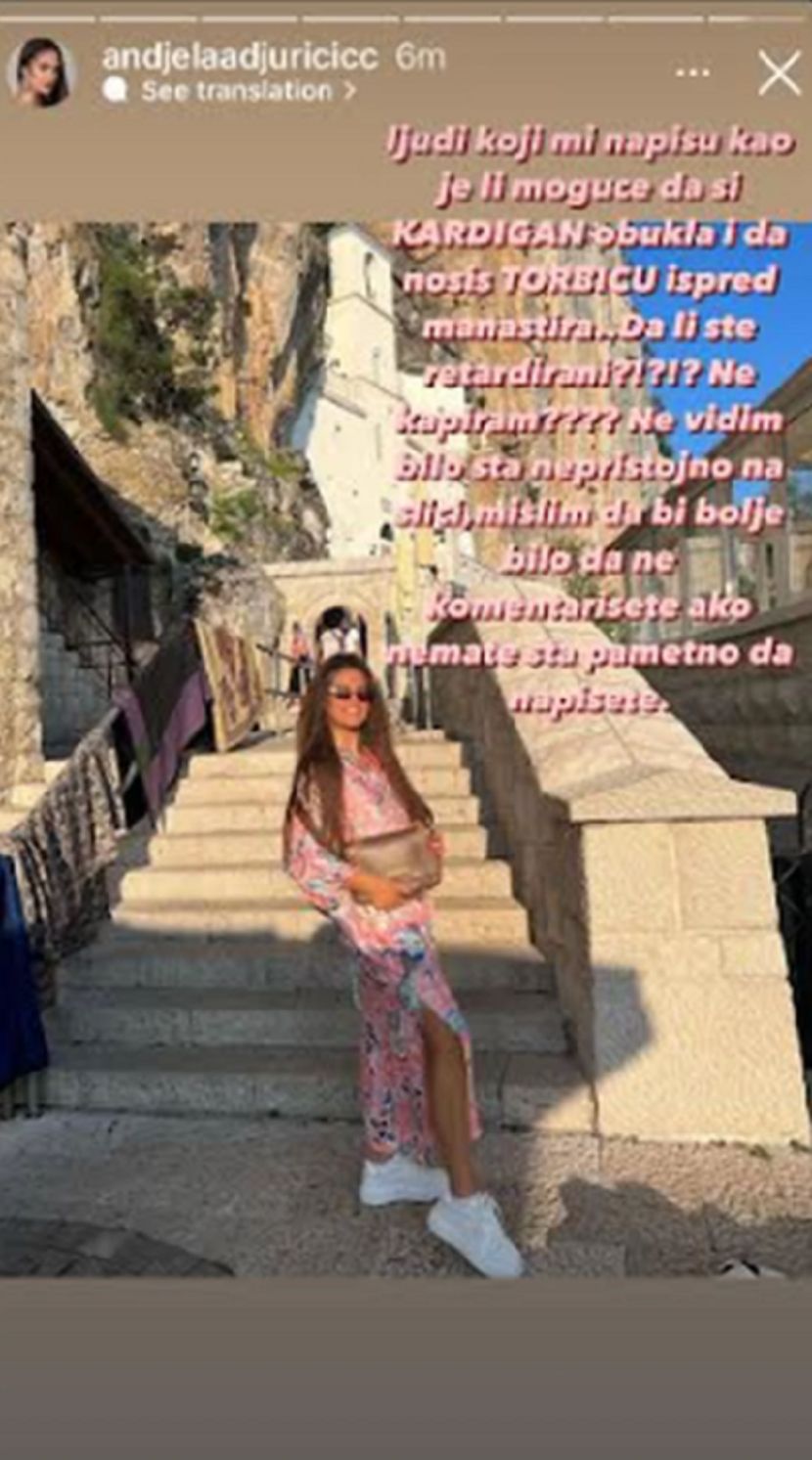 – Ljudi koji mi napišu kao: “Je li moguće da si kardigan obukla i da nosiš torbicu ispred manastira?”. Da li ste retardirani? Ne kapiram? Ne vidim bilo šta nepristojno na slici. Mislim da i bolje bilo da me ne komentarišete ako nemate šta pametno da napišete – poručila je Anđela.