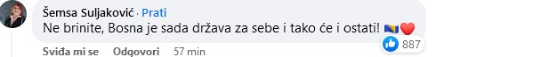Ona je naime sebi dala prostora za komentar nakon najave predsjednika Srbije, te je kratko poručila: “Ne brinite, Bosna je sada država za sebe i tako će i ostati.”