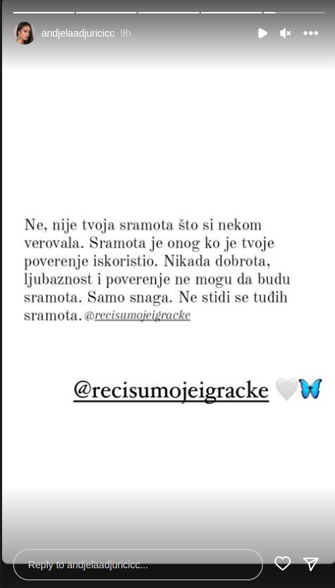 – Ne, nije tvoja sramota što si nekom verovala. Sramota je onoga ko je tvoje poverenje iskoristio. Nikada dobrota, ljubaznost i poverenje ne mogu da budu sramota. Samo snaga. Ne stidi se tuđih sramota – glasio je citat koji je Đuričićeva podelila na svom Instagram profilu.