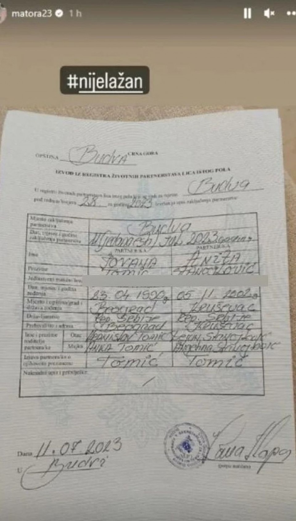 Samim tim ova informacija je unijela sumnju u ljude, a dan nakon intimne ceremonije, Matora je fotografisala papir na kome se vidi da je udata za Anitu i kratko poručila: Nije lažan.
