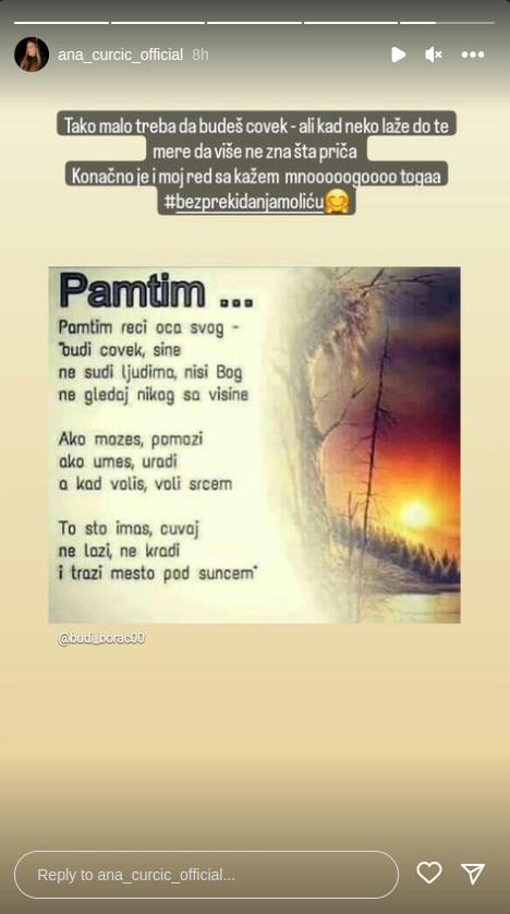 – Tako malo treba da budeš čovek, ali kad neko laže do te mjere da više ne zna šta priča… Konačno je moj red da kažem mnogo toga – najavila je Ćurčićeva, a ostaje da vidimo šta je to riješila da iznese u javnost.