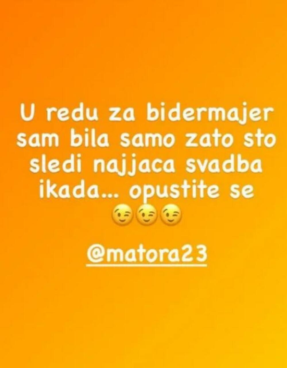 – U redu za bidermajer sam bila samo zato što sledi najjača svadba ikada… Opustite se – napisala je Anita i tagovala Matoru.