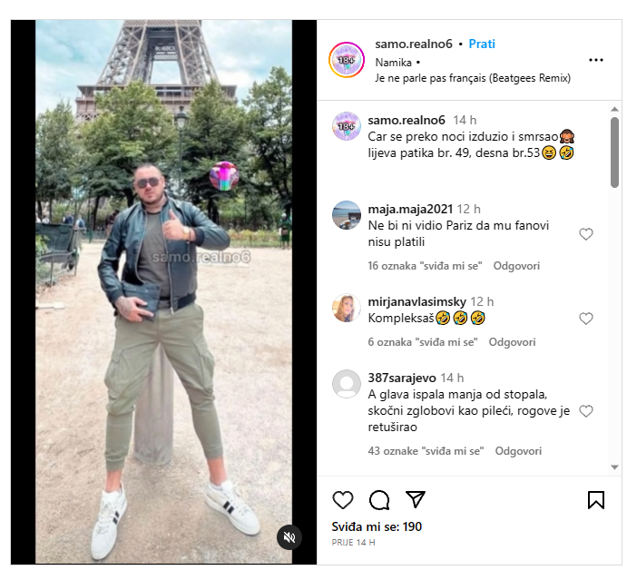 – “Car se preko noći izdužio i smršao, leva patika broj 49, desna 53”, “Glava ispala manja od stopala, skočni zglobovi kao pileći, rogove je retuširao”, “Vidi mu glave u odnosu na telo, kao čioda, a ustvari je obrnuto”, “Od Krompira do manekena, tanka je linija kad ga slika stjuardesa Aleks, pa po običaju zabrlja i fotošop”, “A vidi mu glave ko kliker, gde nestade ona medveđa glava”, “Ne bi ni video Pariz da mu fanovi nisu platili” – poručili su fanovi.