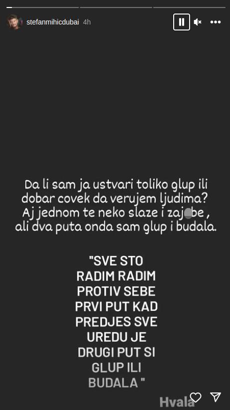 Da li sam ja ustvari toliko glup ili dobar čovek da verujem ljudima. Aj jedanput te neko slaže i zaj*be, ali dva puta, onda sam glup i budala – napisao je Stefan, a zatim obrazložio ovu misao: