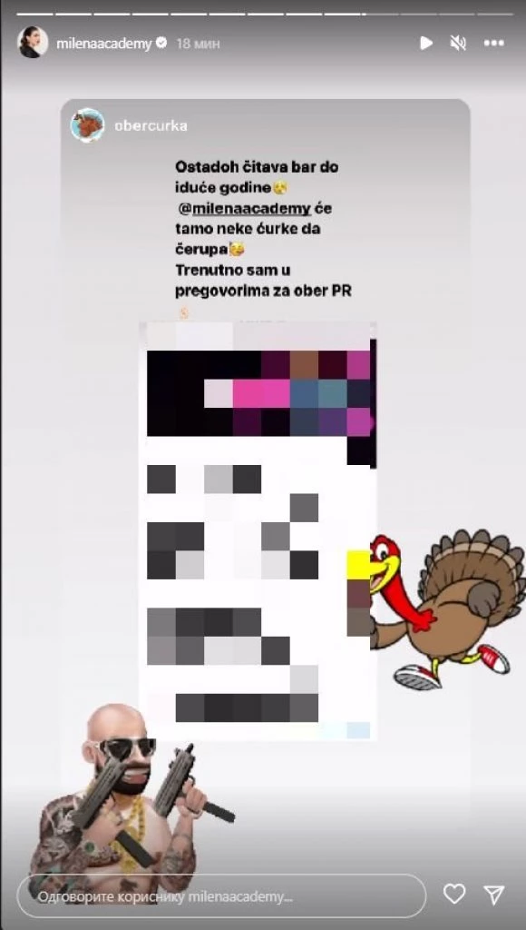 – Ostadoh čitava bar do iduće godine. Milena će tamo neke ćurke da čerupa. Trenutno sam u pregovorima za ober PR – stoji u objavi, koju je Kačavenda podelila.