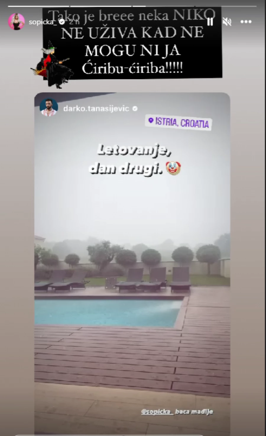 Na Instagramu je isprovocirao koleginicu voditeljku Ivanu Šopić koja mu je ubrzo i odgovorila. Međutim, izgleda da su Darka stigle ,,kletve” koleginice, budući da ga je već dan kasnije sačekala oluja, te nije mogao da uživa.