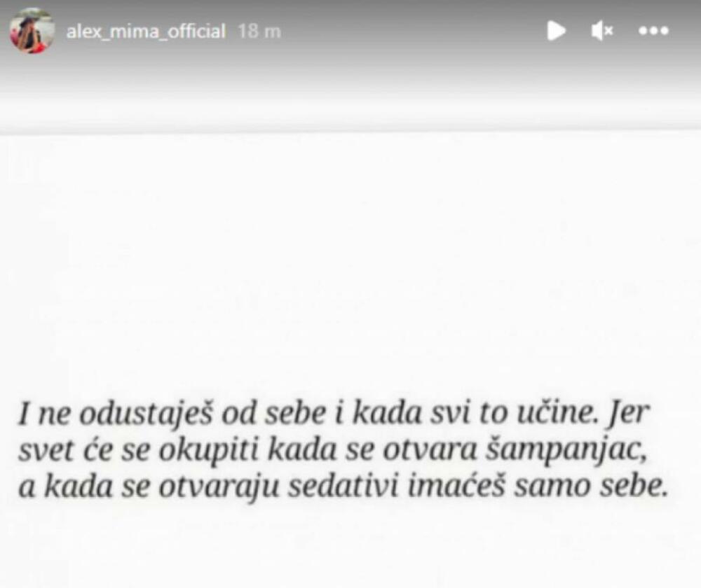 – I ne odustaješ od sebe i kada svi to učine! Jer svet će se okupiti kada se otvara šampanjac, a kada se otvaraju sedativi imaćeš samo sebe – glasila je poruka koju je Aleksandra podelila na Instagram storiju.