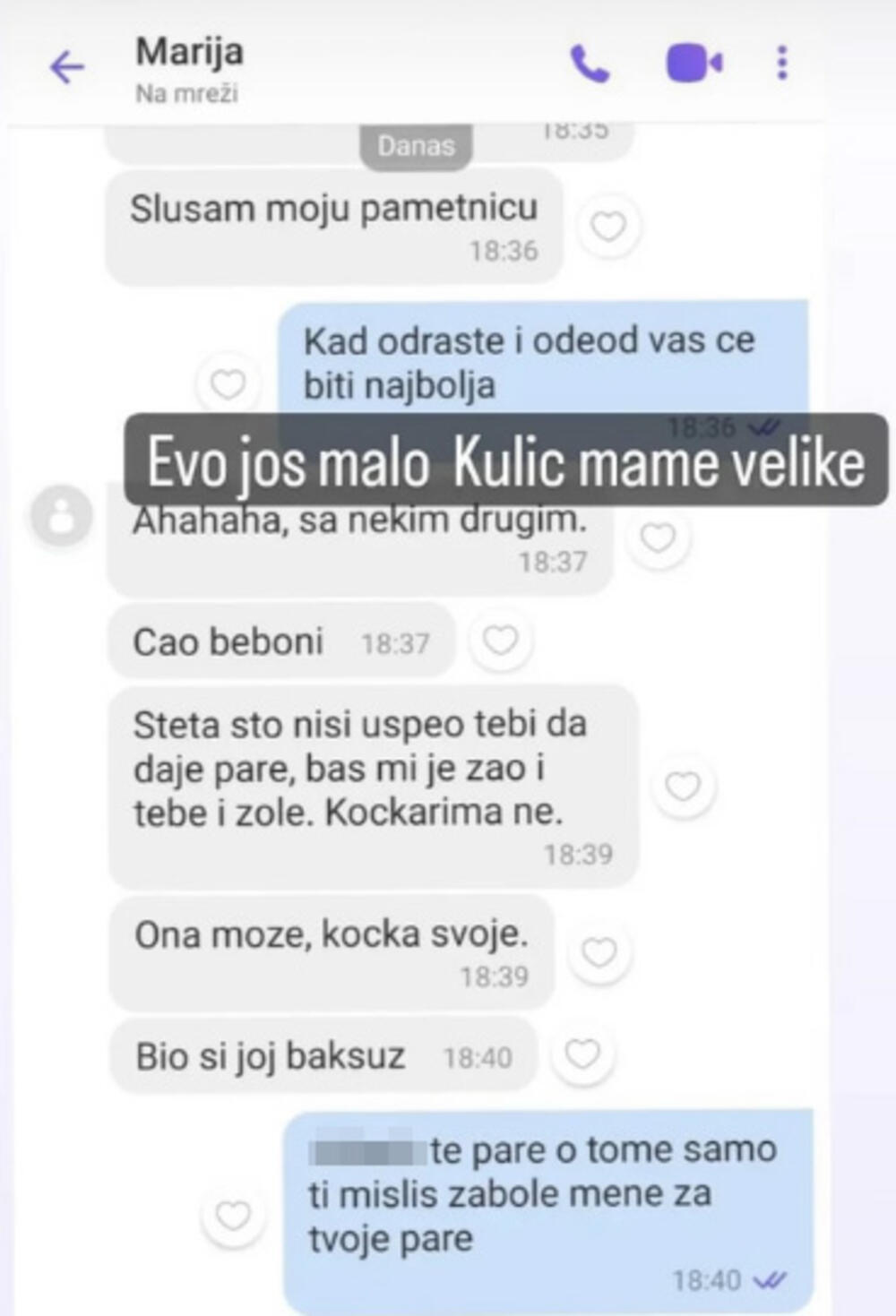 Inače, Bebica je na Instagramu obelodanio prepisku sa Marijom, u kojoj se vidi da joj je napisao kako ona njemu duguje novac. S druge strane, pitao ju je i da li ona prodaje svoju ćerku na taj način što će Miljana ponovo ući u rijaliti.