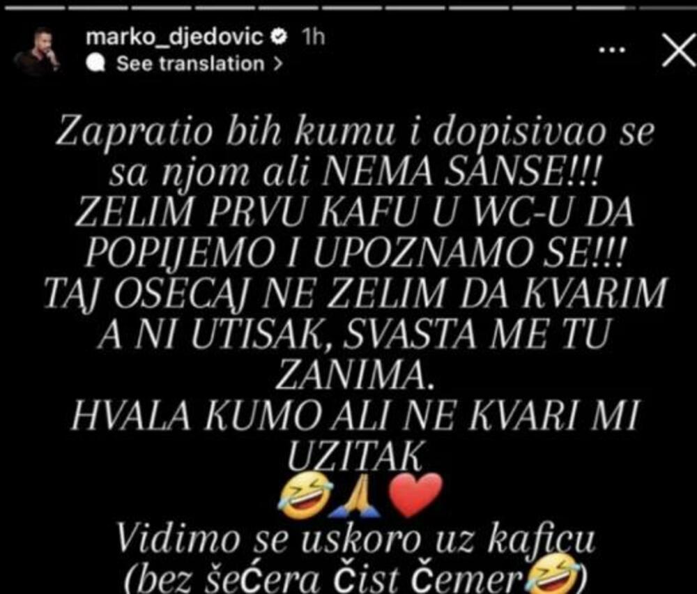 – Zapratio bih kumu i dopisivao se sa njom, ali nema šanse!!! Želim prvu kafu u wc-u da popijemo i upoznamo se!!! Taj osećaj ne želim da kvarim, a ni utisak, svašta me tu zanima. Hvala kumo, ali ne kvari mi užitak. Vidimo se uskoro uz kaficu (bez šećera čist čemer) – napisao je Marko na svom Instagram storiju.
