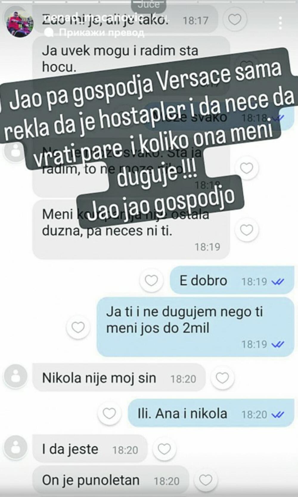 „E dobro, ja tebi ne dugujem, nego ti meni još dva miliona. Ili Ana, ili Nikola“, napisao je Bebica, misleći na Marijinu ćerku Anu i njenog dečka kojima je navodno pozajmio novac.