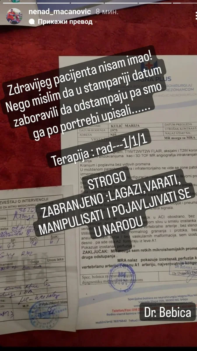 – Zdravijeg pacijenta nisam imao! Nego mislim da u štampariji datum zaboravili da odštampaju, pa smo ga po potrebi upisali. Terapija rad 1/1/1. Strogo zabranjeno: Lagati, varati, manipulisati i pojavljivati se u narodu. DR Bebica – napisao je sad Macanović na storiju na Instagramu i šokirao sve, budući da je kao dokaz priložio i lekarski izveštaj.