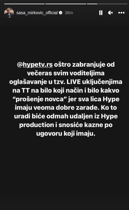 – Hajp oštro zabranjuje od večeras svim voditeljima oglašavanje u tzv. LIVE uključenjima na TT na bilo koji način i bilo kakvo “prenošenje novca” jer sva lica na Hzpe imaju veoma dobre zarade. Ko to uradi biće odmah udaljen iz Hajp produkcije i snosiće kazne po ugovoru koji imaju – stoji u objavi.