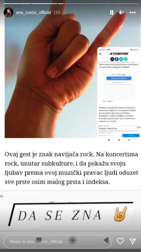 – Ovaj gest je znak navijača rok. Na koncertima rok, unutar subkulture, da pokažu svoju ljubav prema ovoj muzički prvac ljudima oduzeti sve prste osim malog i indeksa – stoji u ovoj čudnoj objavi, odakle saznajemo da je Ana očigledno veliki fan rok muzike.