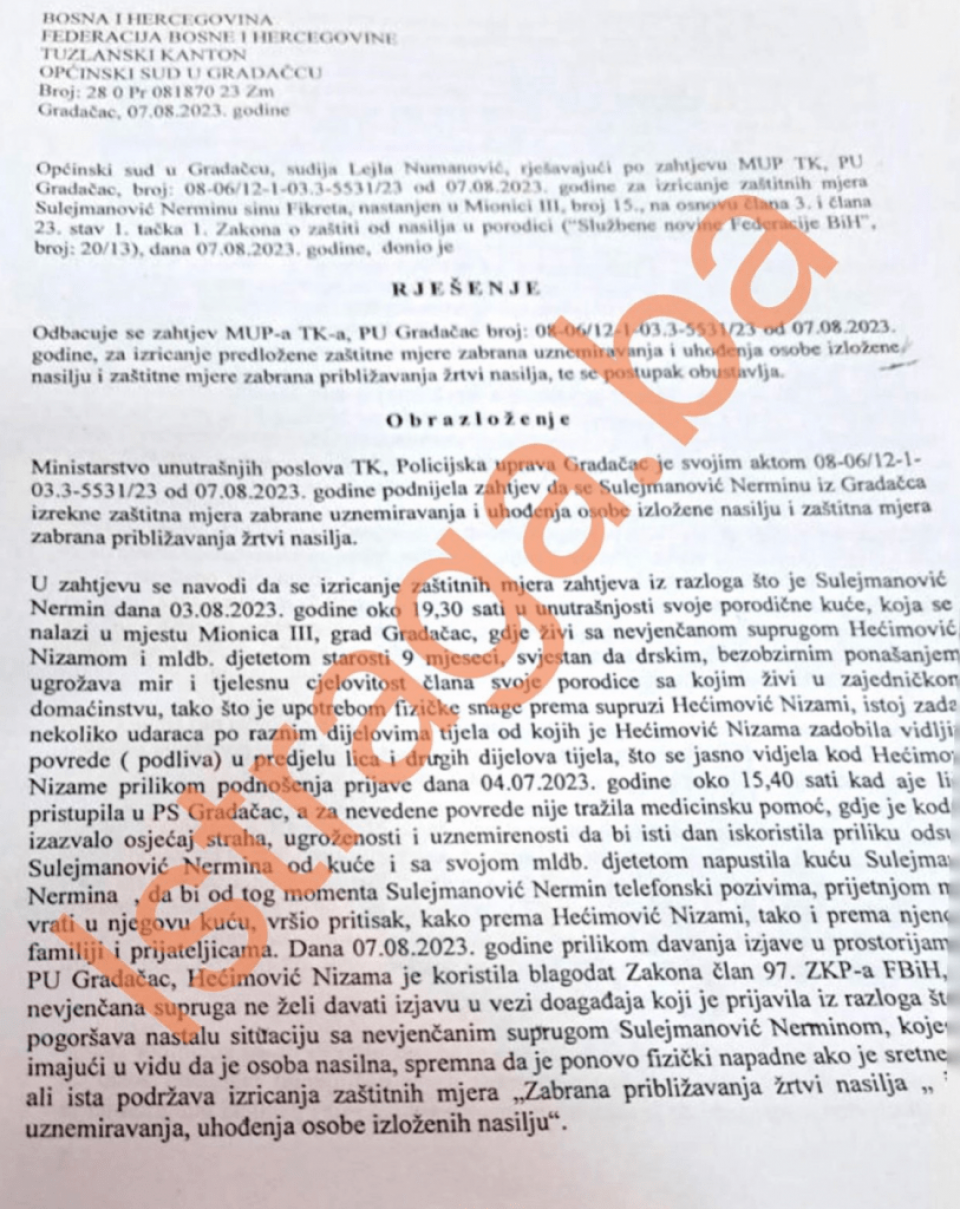 “Odbacuje se zahtjev MUP-a TK za izricanje predložene zaštitne mjere zabrane uznemiravanja i uhođenja osobe izložene nasilju i zaštitna mjera približavanja žrtvi nasilja, te se postupak obustavlja”, presudila je općinska sutkinja iz Gradačca Lejla Numanović.