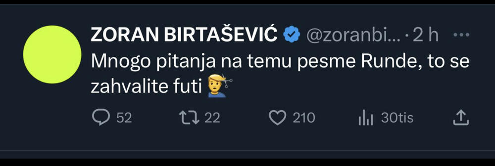 “Mnogo pitanja na temu pesme Runde, to se zahvalite futi” – napisao je Birtašević u originalu, aludirajući kako se zbog njegovih poteza, pesma neće naći na albumu.