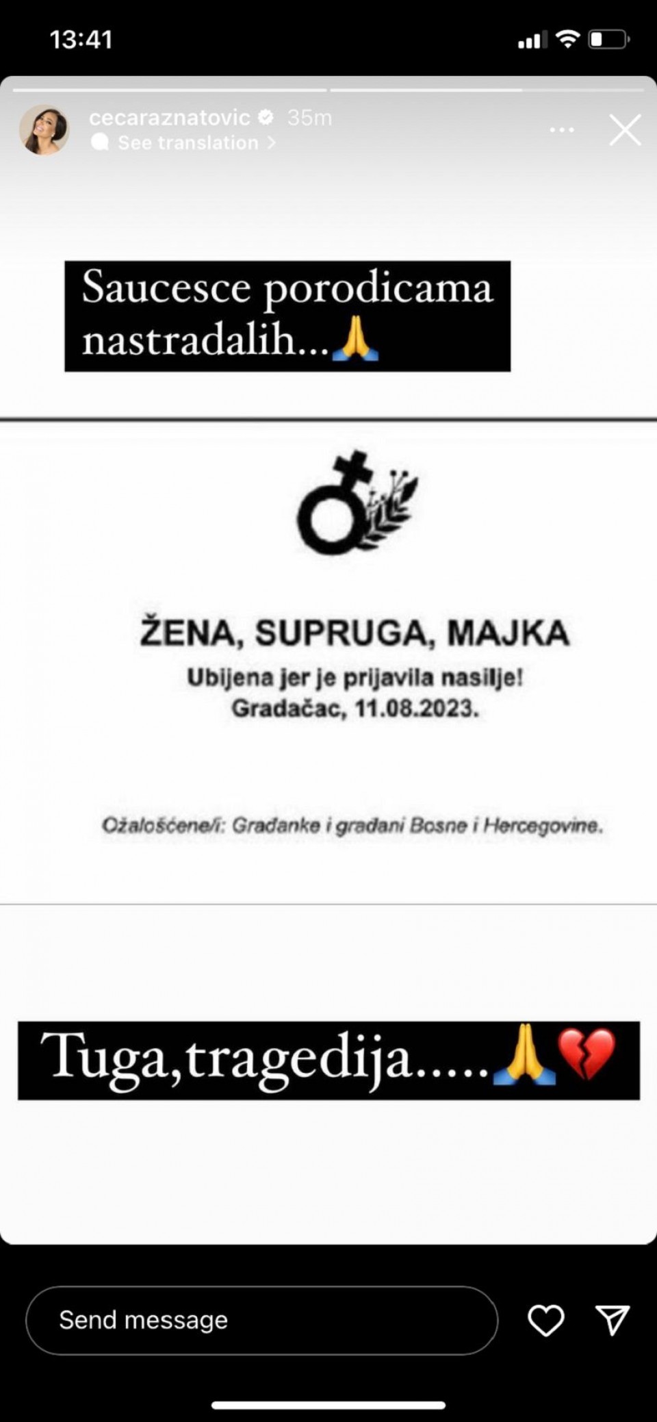 Ceca je podijelila fotografiju koja se masovno dijeli društvenim mrežama, a na kojoj piše: “Žena supruga, majka, ubijena jer je prijavila nasilje. Gradačac, 11.8.2023. Ožalošćeni: građani i građanke Bosne i Hercegovine.”