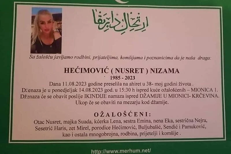 Duboko potresen Gradačac i cijela država suočava se s teškom tugom nakon tragičnog gubitka nevino preminule Nizame Hećimović, koju brutalno pretukao a zatim ubio nevjenčani suprug Nermin Sulejmanović.