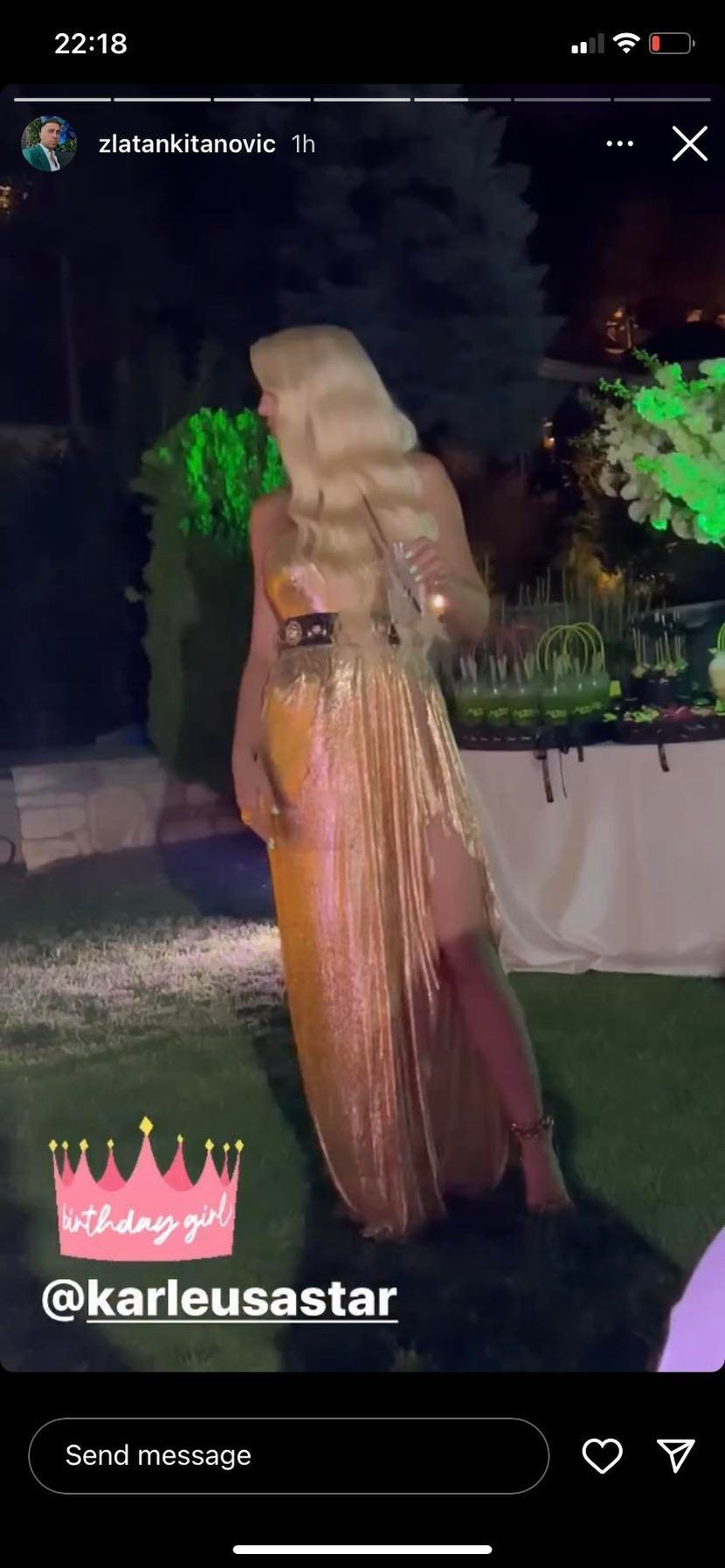 Za ovu priliku, Karli je obukla zlatnu haljinu sa dubokim šlicem, koju je upotpunila zlatnim pojasem i sandalama na štiklu.