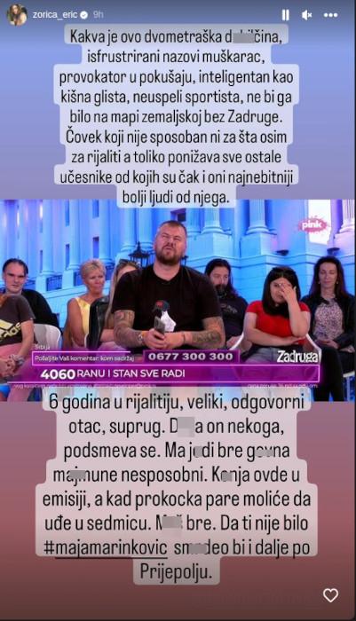 Kakva je ovo dvometraška de***čina, isfrustrirani nazovi muškarac, provokator u pokušaju, inteligentan kao kišna glista, neuspeli sportista, ne bi ga bilo na mapi zemaljskoj bez Zadruge. Čovek koji nije sposoban ni za šta osim za rijaliti, a toliko ponižava sve ostale učesnike od kojih su čak i oni najnebitniji bolji od njega. – napisala je Zorica.
