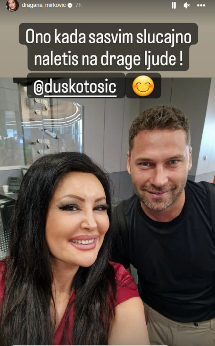 – Ono kad slučajno naletiš na drage ljude! – napisala je Dragana Mirković u objavi koju je Duško ripostovao na svom nalogu.