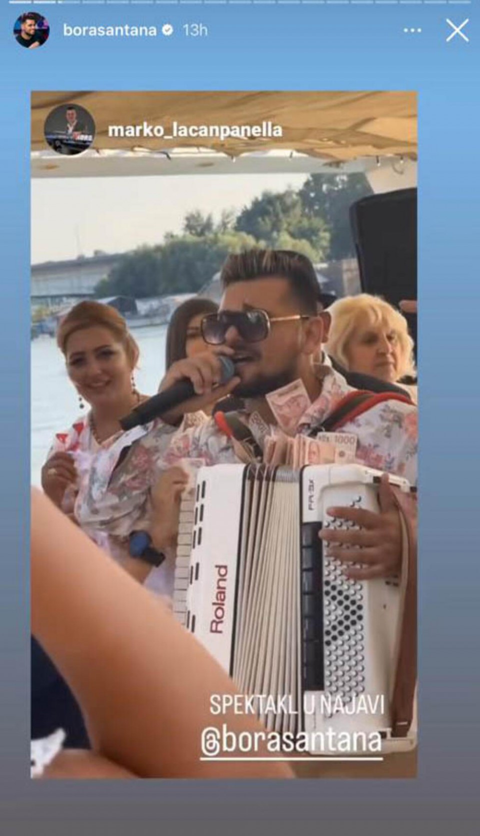 Pored dana su pjevali Beki Bekić, kao orkestar Borka Radivojevića. Cijeli program od ujutro do zore vodio je Bora Santana, koji od završetka rijalitija Zadruga, vodi romske svadbe. I pored svoje “uloge domaćina”, Santana je i zapjevao i zasvirao pa je, pored svog standardnog honorara, dobro zaradio i uz bakšiš.
