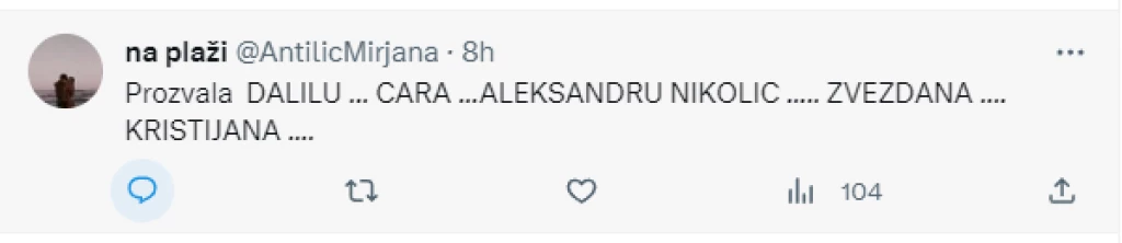 – Prozvala Dalilu, Cara, Aleksandru Nikolić, Zvezdana i Kristijana – napisala joj je jedna korisnica.