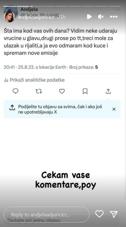 Ne zna se na koga je sve Anđela mislila od bivših zadrugara u ovom tvitu, ali nesumnjivo da će se mnogi u njemu pronaći. U svakom slučaju neko moli da uđe u rijaliti, a neko poput Anđele imaće od septembra svoju emsiiju na Hajpu.