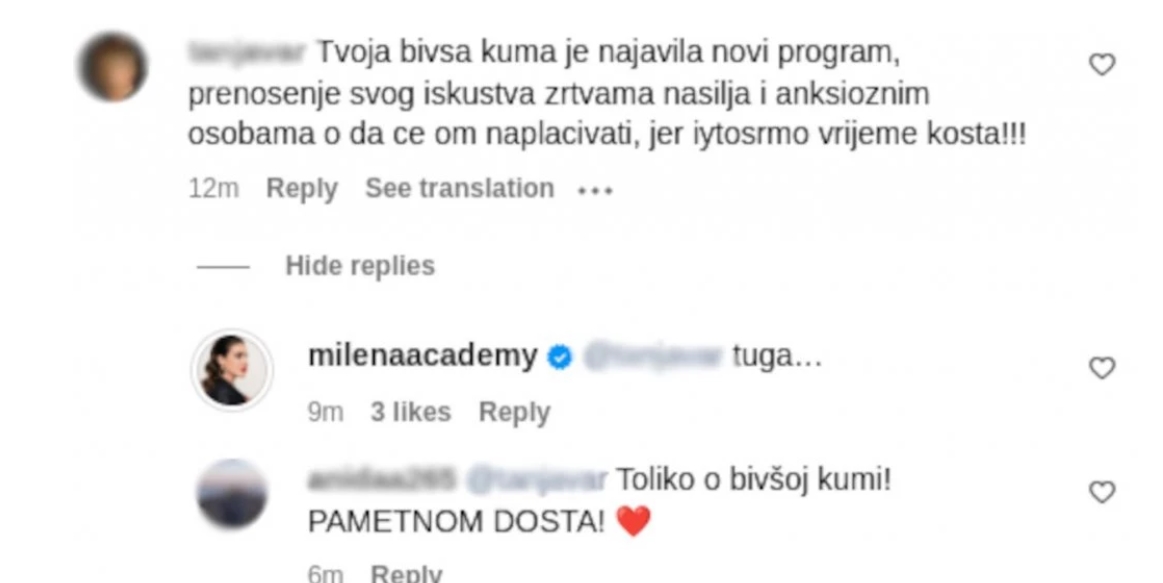 – Tvoja bivša kuma je najavila novi program, prenošenje svog iskustva žrtvama nasilja i anksioznim osobama i da će im naplaćivati, jer vreme košta – komentar je jednog od fanova, na šta se nadovezala i Milena: