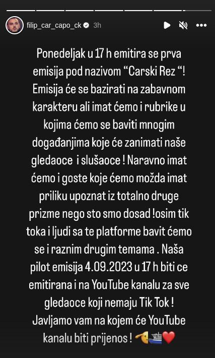 – Ponedeljak u 17h emitovaće se prva emisija pod nazivom ,,Carski rez”. Emisija će se bazirati na zabavnom karakteru, ali ćemo imati i rubrike u kojima ćemo se baviti mnogim događajima koje će zanimati naše gledaoce i slušaoce! Naravno, imaćemo goste koje ćemo možda imati priliku upoznati iz totalno druge prizme, nego što smo do sada! Osim TikToka i ljudi sa te platforme, mi ćemo se baviti i raznim drugim temama – napisao je Filip.