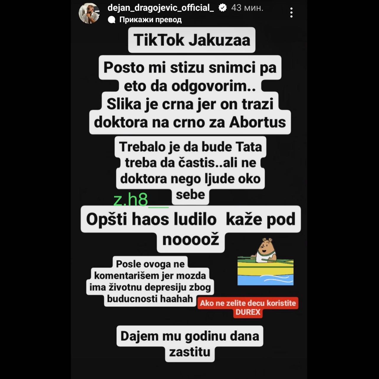 – Pošto mi je stiglo 200 poruka na koga mislim na prošlom storiju. Stori je za Krompira Zetka. Pošto se*e na TikT oku u lajvu o meni da bi dežao gledaoce… Bolje da priča o svom životu i trudnoj ”verenici” i o tome kako planiraju abortus, mislim da će ljude zanimati. Neka napravi anketu na TikToku Univerzum za abortus Lav da ostavi dete Tap tap šer ruža ruža – poručio je Dejan jasno aludirajući na Cara.