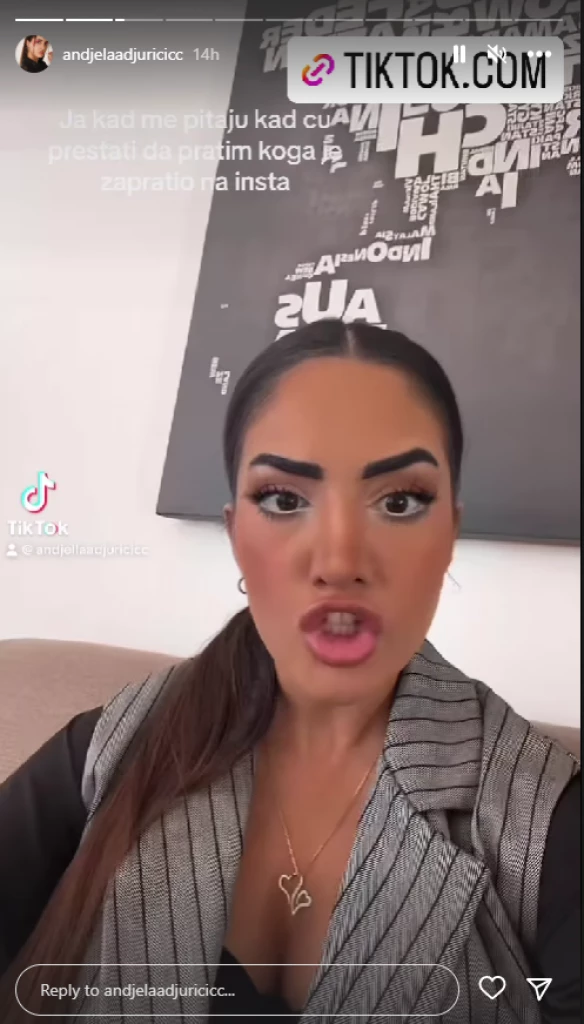 – Ja kad me pitaju kad ću prestati da pratim koga je zapratio na Insta – glasila je poruka koju je bivša zadrugarka napisala uz video-snimak, zbog čega su se fanovi njene ljubavi sa Slavnićem ponadali da je njemu posvetila ovaj snimak i da nakon raskida i dalje prati šta on radi na društvenim mrežama.