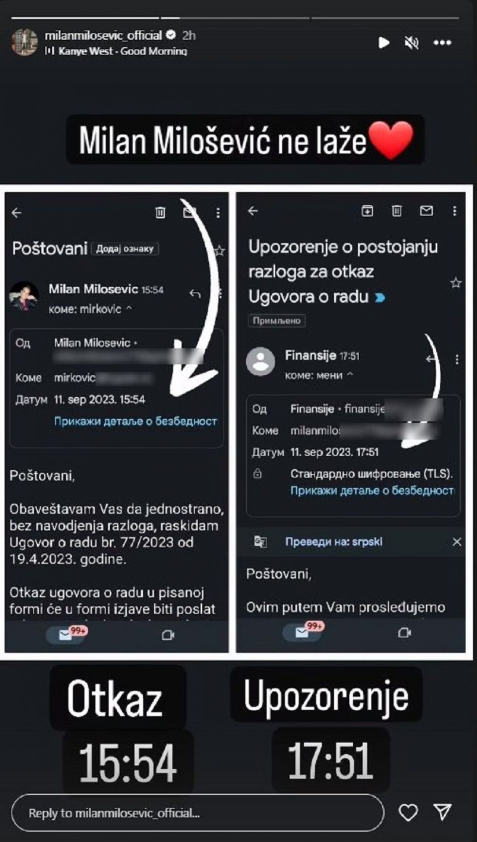 – Molimo vas da ne nasijedate na Instagram objasve. Milan Milošević je danas poslije jučerašnje revizije dolaska i odlaska sa posla dobio upozorenje pred otkaz – napisali su i dodali: