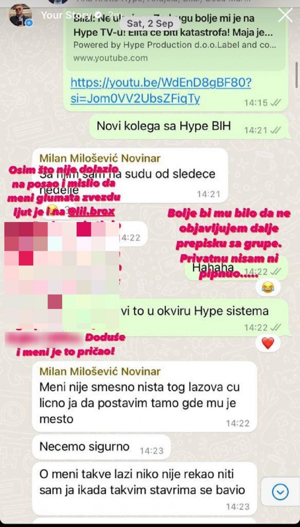 – Tako da on otkaz nije dao niti ga je još uvijek dobio jer ima 8 dana za izjašnjenje po upozorenju o otkazu ugovora o radu. On je još uvijek zaposlen u Hype production i ima obaveze prema istoj firmi – poručili su oni, a Mirković je između ostalog naveo: “Osim što nije dolazio na posao i mislio da meni glumata zvijezdu ljut je i na Bilala. Bolje bi mu bilo da ne objavljujem dalje prepisku sa grupe.”