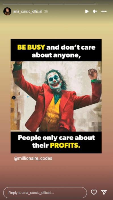 Ono što svi očekuju, jeste komentar upravo Ane Ćurčić na ulazak njene bivše zaposlene kozmetičarke. Ona se za sada nije direktno oglasila, međutim, na svoj Instagram stori je objavila jednu poruku koju su mnogi protumačili kao upućenu Dragani i njenom ulasku u “Elitu”.